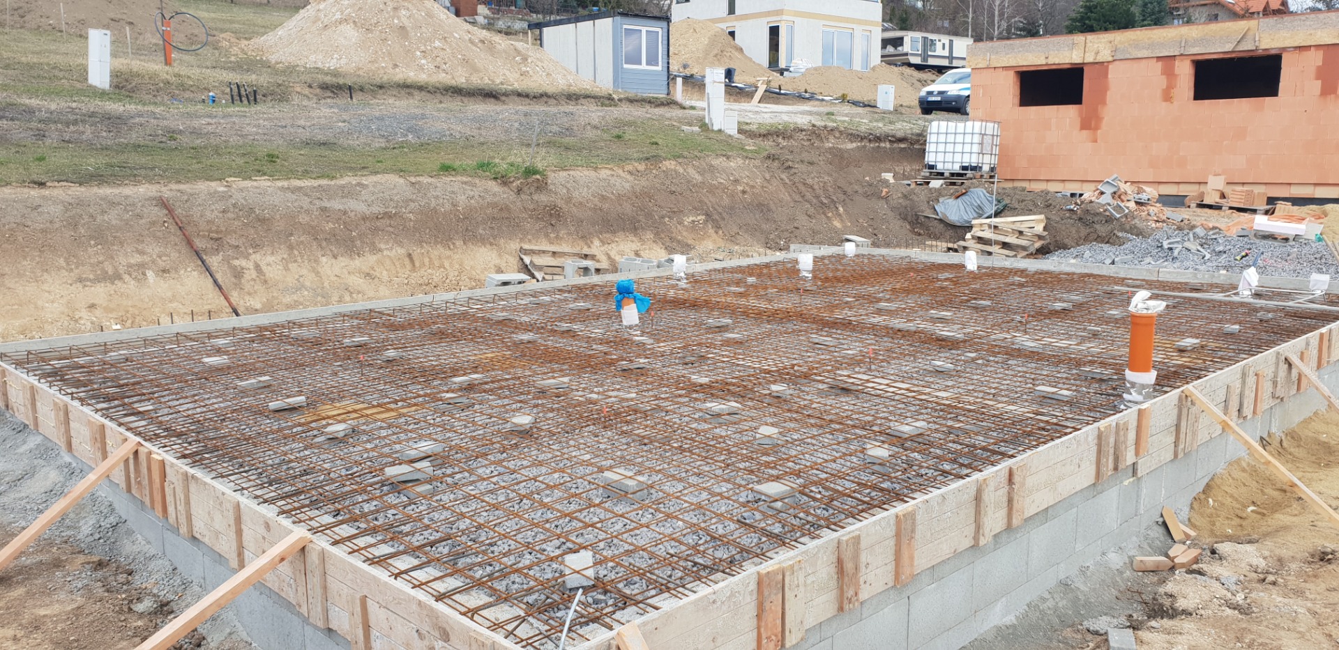 Dům se nachází na svažitém pozemku, což si vyžádalo pečlivé provedení terénních úprav, výstavbu opěrných částí a přesné napojení všech zpevněných ploch. Projekt jsme dokončili v plném rozsahu a investoři si následně vlastními silami dokončili okolí domu, včetně zahrady, doplňkových prvků a finálních detailů.